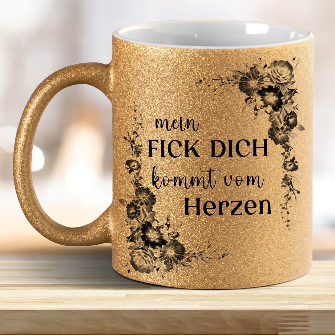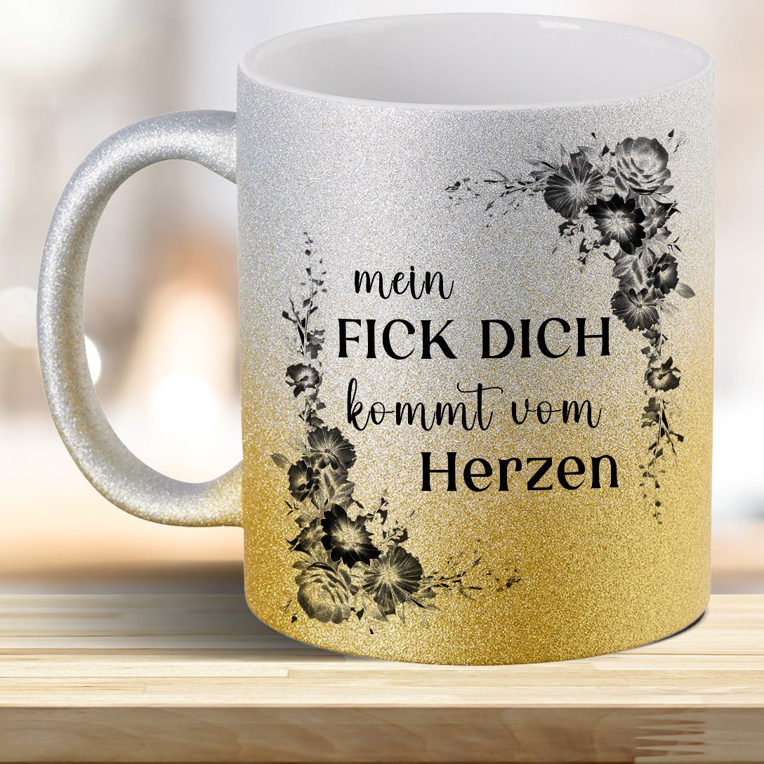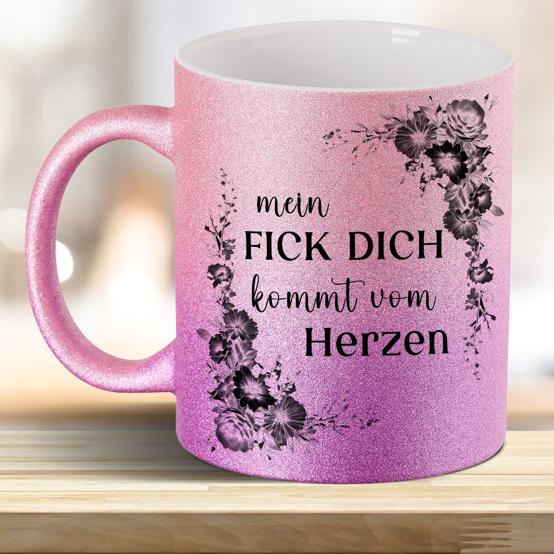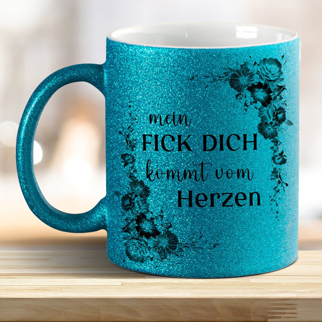 Entdecke unsere Mein Fick Dich kommt von Herzen! Tasse mit Glitzereffekt mit trendigen Farben