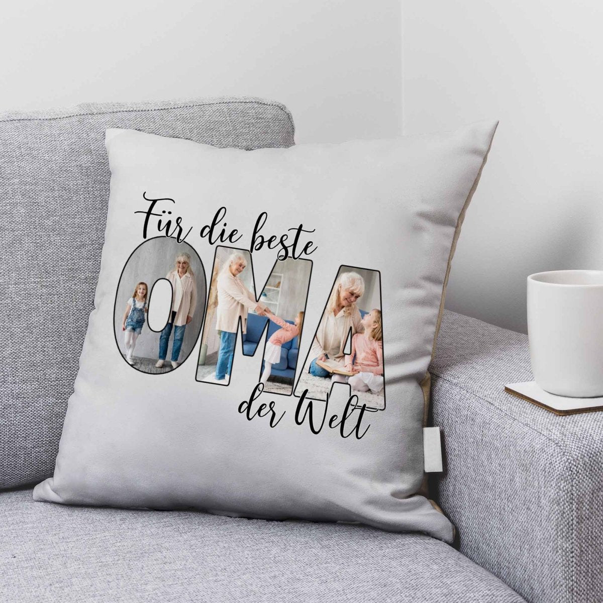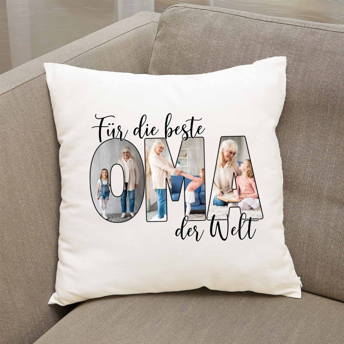 Das Wort „OMA“ wird mit euren eigenen Fotos gefüllt und macht jedes Kissen zu einem echten Einzelstück