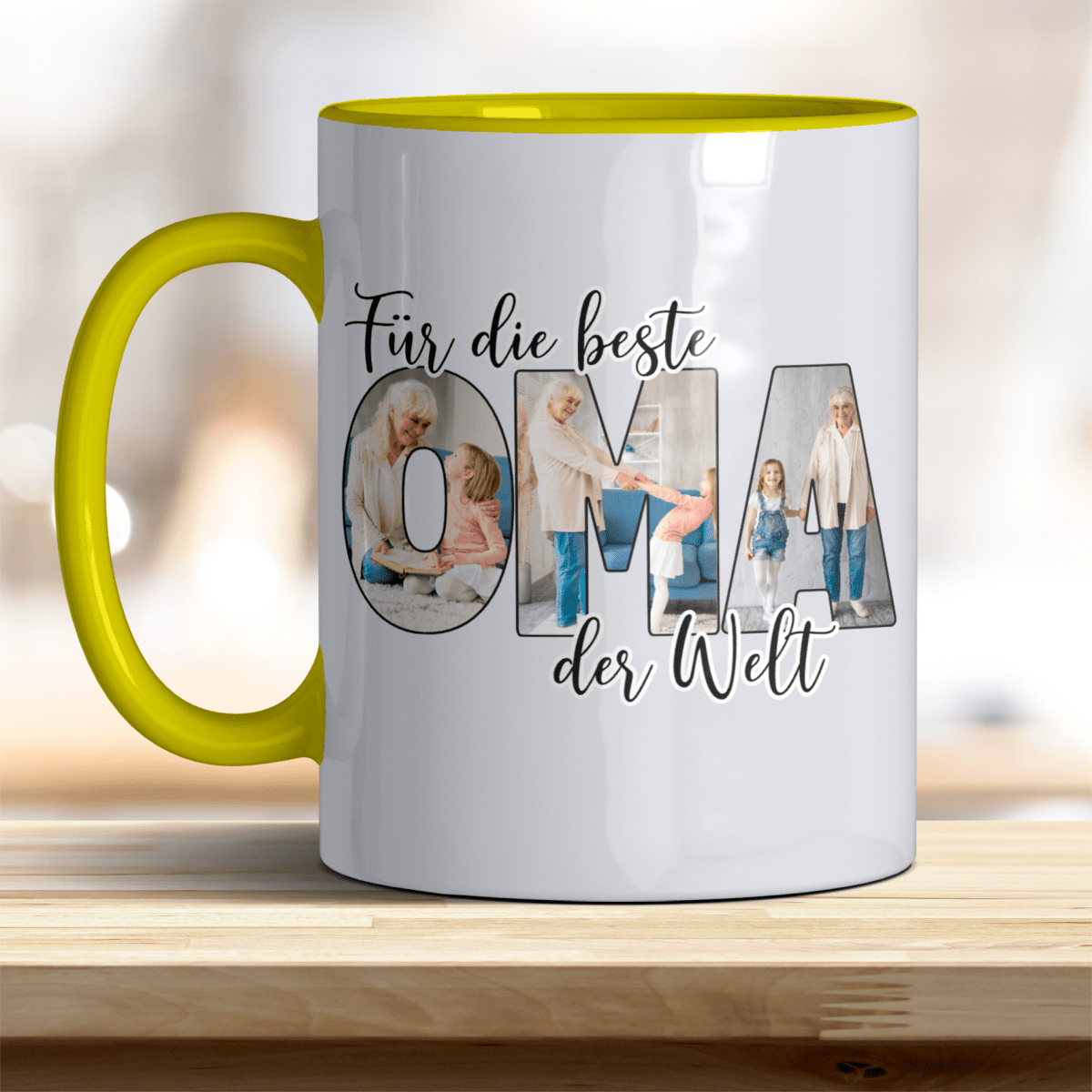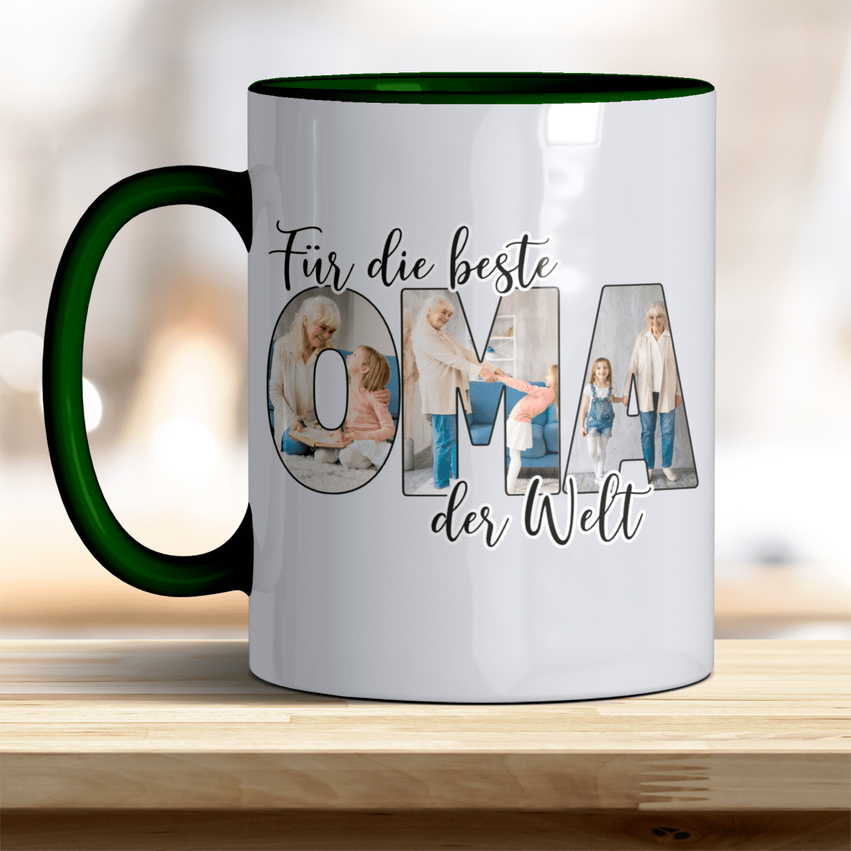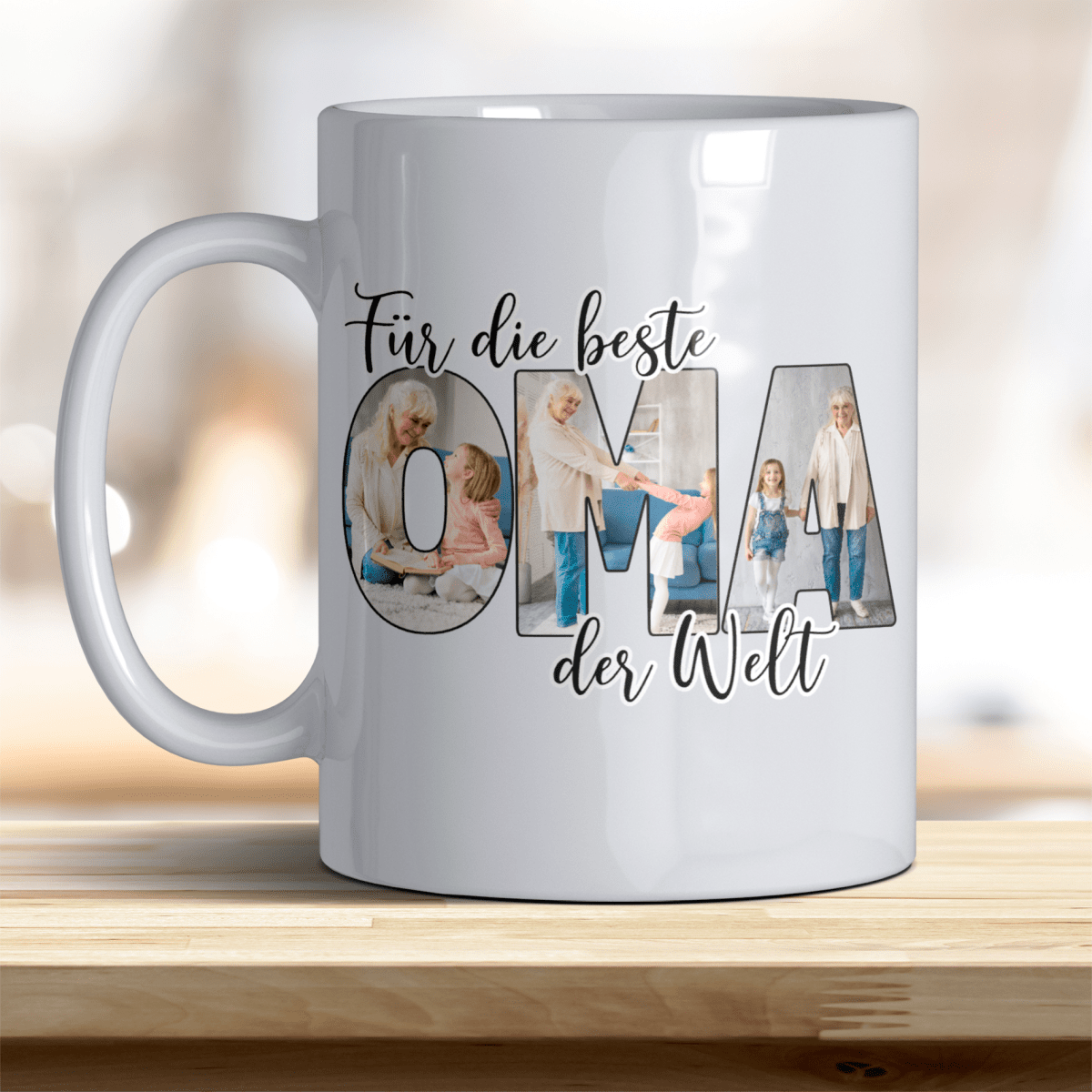 Das Wort „OMA“ wird aus euren eigenen Fotos gestaltet und macht jede Tasse zu einem echten Unikat.